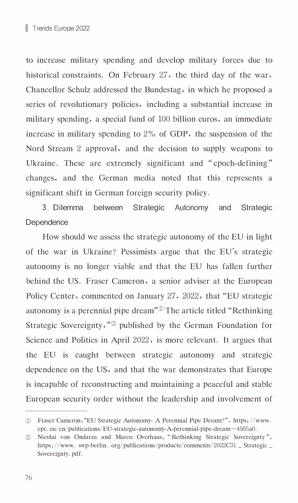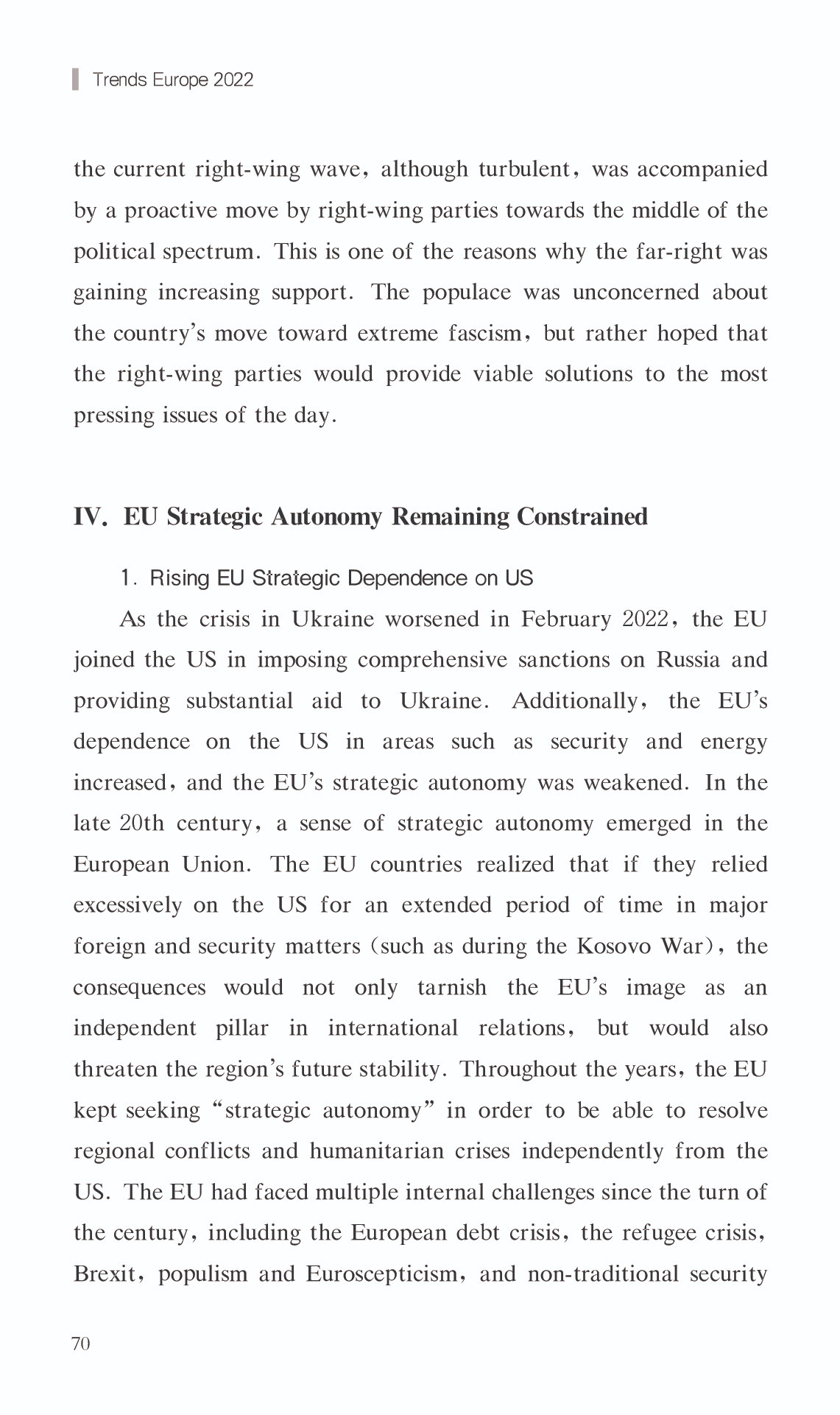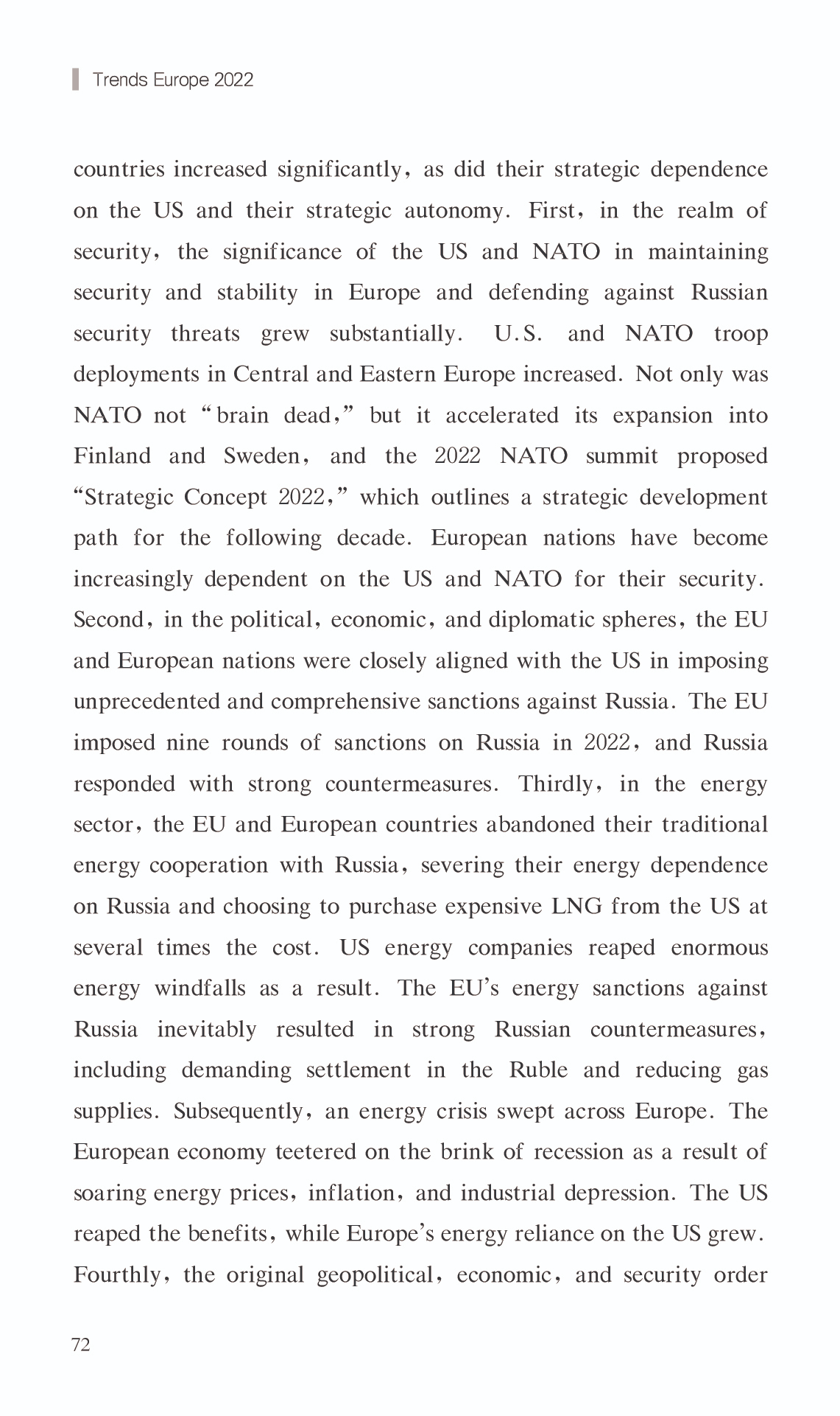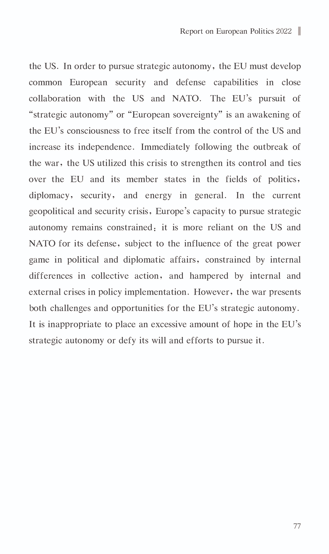 { "@context": "https://schema.org", "@graph": [ { "@type": "AnalysisNewsArticle", "headline": "Report on European Politics 2022", "name": "Report on European Politics 2022", "description": "In 2022, the war in Ukraine shook the world, marking \u0022unprecedented upheaval in the world, in the times, and in the course of history”. Europe descended into the gravest geopolitical and security crisis since World War Il, and European nations passed a “historic turning point\u0022 in their policy orientation. In a number of European nations, 2022 was a turbulent election year in which the influence of the far right grew. As the European Union\u0027s reliance on the United States increased, its strategic autonomy diminished.", "datePublished": "Wed, 03/15/2023 - 12:00", "publisher": { "@type": "EducationalOrganization", "@id": "SAGGAS", "name": "Shanghai Academy of Global Governance \u0026 Area Studies (SAGGAS)" } }, { "@type": "Person", "name": "Report on European Politics 2022", "description": "In 2022, the war in Ukraine shook the world, marking \u0022unprecedented upheaval in the world, in the times, and in the course of history”. Europe descended into the gravest geopolitical and security crisis since World War Il, and European nations passed a “historic turning point\u0022 in their policy orientation. In a number of European nations, 2022 was a turbulent election year in which the influence of the far right grew. As the European Union\u0027s reliance on the United States increased, its strategic autonomy diminished." } ] }