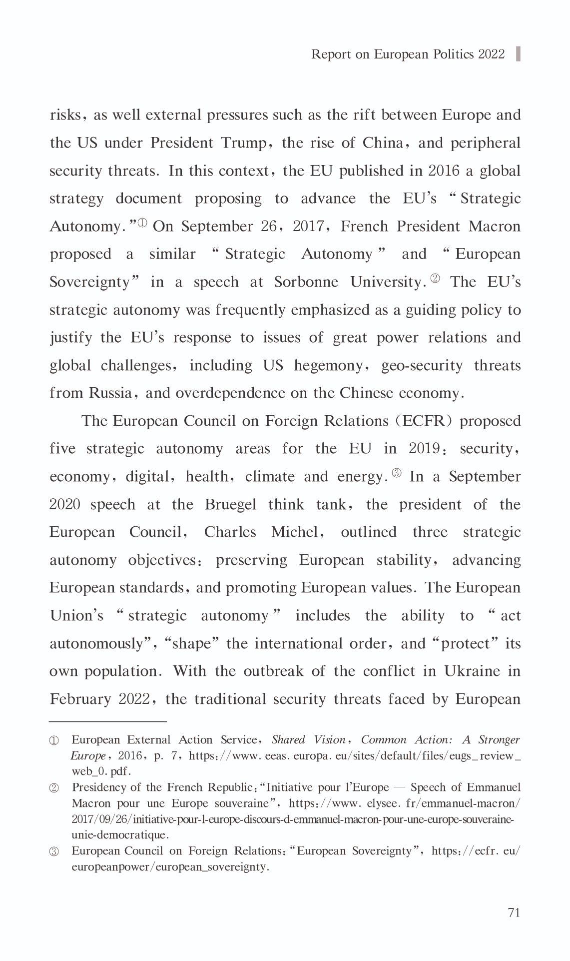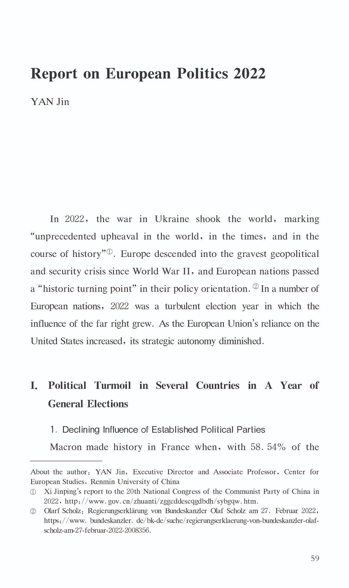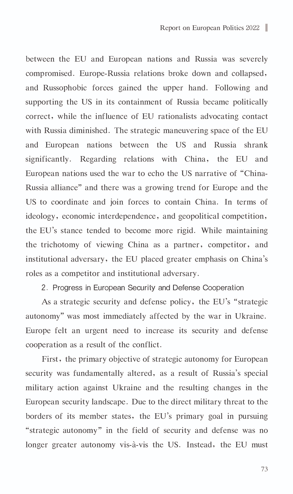 { "@context": "https://schema.org", "@graph": [ { "@type": "AnalysisNewsArticle", "headline": "Report on European Politics 2022", "name": "Report on European Politics 2022", "description": "In 2022, the war in Ukraine shook the world, marking \u0022unprecedented upheaval in the world, in the times, and in the course of history”. Europe descended into the gravest geopolitical and security crisis since World War Il, and European nations passed a “historic turning point\u0022 in their policy orientation. In a number of European nations, 2022 was a turbulent election year in which the influence of the far right grew. As the European Union\u0027s reliance on the United States increased, its strategic autonomy diminished.", "datePublished": "Wed, 03/15/2023 - 12:00", "publisher": { "@type": "EducationalOrganization", "@id": "SAGGAS", "name": "Shanghai Academy of Global Governance \u0026 Area Studies (SAGGAS)" } }, { "@type": "Person", "name": "Report on European Politics 2022", "description": "In 2022, the war in Ukraine shook the world, marking \u0022unprecedented upheaval in the world, in the times, and in the course of history”. Europe descended into the gravest geopolitical and security crisis since World War Il, and European nations passed a “historic turning point\u0022 in their policy orientation. In a number of European nations, 2022 was a turbulent election year in which the influence of the far right grew. As the European Union\u0027s reliance on the United States increased, its strategic autonomy diminished." } ] }