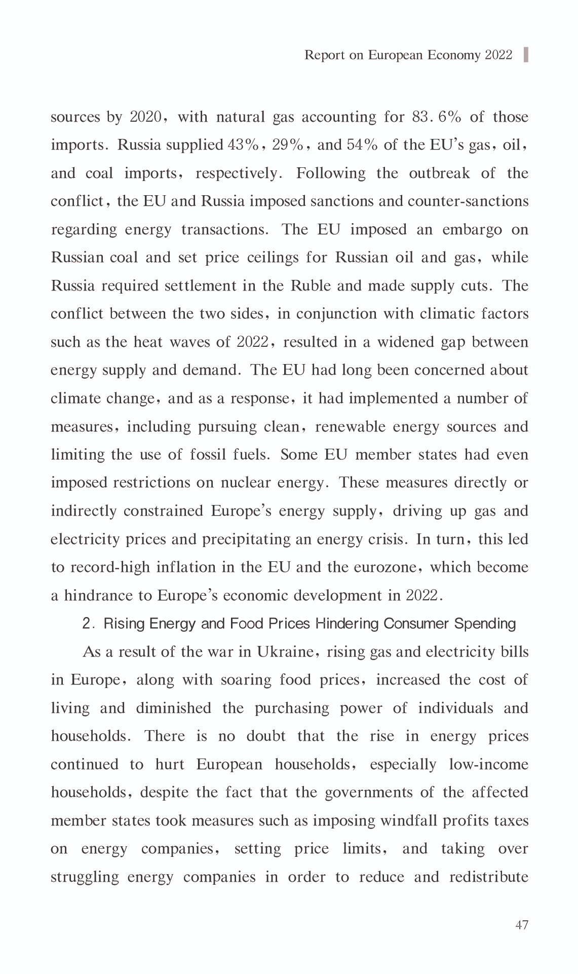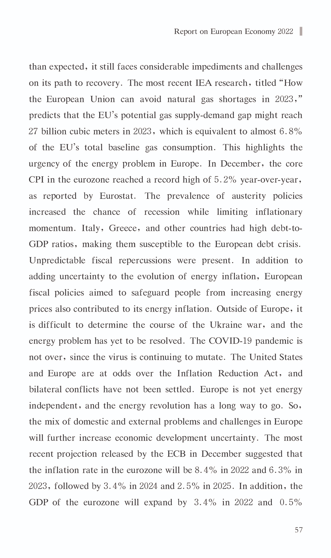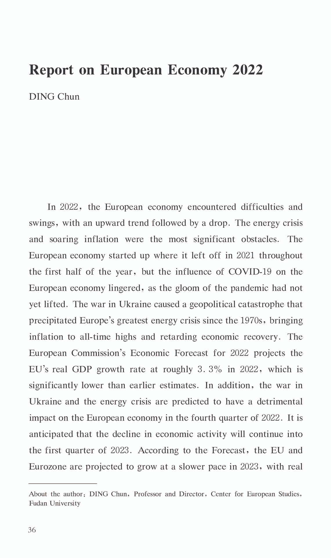 { "@context": "https://schema.org", "@graph": [ { "@type": "AnalysisNewsArticle", "headline": "Report on European Economy 2022", "name": "Report on European Economy 2022", "description": "In 2022, the European economy encountered difficulties and swings, with an upward trend followed by a drop. The energy crisis and soaring inflation were the most significant obstacles. The European economy started up where it left off in 2021 throughout the first half of the year, but the influence of COVID-19 on the European economy lingered, as the gloom of the pandemic had not yet lifted. The war in Ukraine caused a geopolitical catastrophe that precipitated Europe\u0027s greatest energy crisis since the 1970s, bringing inflation to all-time highs and retarding economic recovery. The European Commission\u0027s Economic Forecast for 2022 projects the EU\u0027s real GDP growth rate at roughly 3.3% in 2022, which is significantly lower than earlier estimates. In addition, the war in Ukraine and the energy crisis are predicted to have a detrimental impact on the European economy in the fourth quarter of 2022. It is anticipated that the decline in economic activity will continue into the first quarter of 2023. According to the Forecast, the EU and Eurozone are projected to grow at a slower pace in 2023,with real GDP growth of just 0.3% .", "datePublished": "Wed, 03/15/2023 - 12:00", "publisher": { "@type": "EducationalOrganization", "@id": "SAGGAS", "name": "Shanghai Academy of Global Governance \u0026 Area Studies (SAGGAS)" } }, { "@type": "Person", "name": "Report on European Economy 2022", "description": "In 2022, the European economy encountered difficulties and swings, with an upward trend followed by a drop. The energy crisis and soaring inflation were the most significant obstacles. The European economy started up where it left off in 2021 throughout the first half of the year, but the influence of COVID-19 on the European economy lingered, as the gloom of the pandemic had not yet lifted. The war in Ukraine caused a geopolitical catastrophe that precipitated Europe\u0027s greatest energy crisis since the 1970s, bringing inflation to all-time highs and retarding economic recovery. The European Commission\u0027s Economic Forecast for 2022 projects the EU\u0027s real GDP growth rate at roughly 3.3% in 2022, which is significantly lower than earlier estimates. In addition, the war in Ukraine and the energy crisis are predicted to have a detrimental impact on the European economy in the fourth quarter of 2022. It is anticipated that the decline in economic activity will continue into the first quarter of 2023. According to the Forecast, the EU and Eurozone are projected to grow at a slower pace in 2023,with real GDP growth of just 0.3% ." } ] }